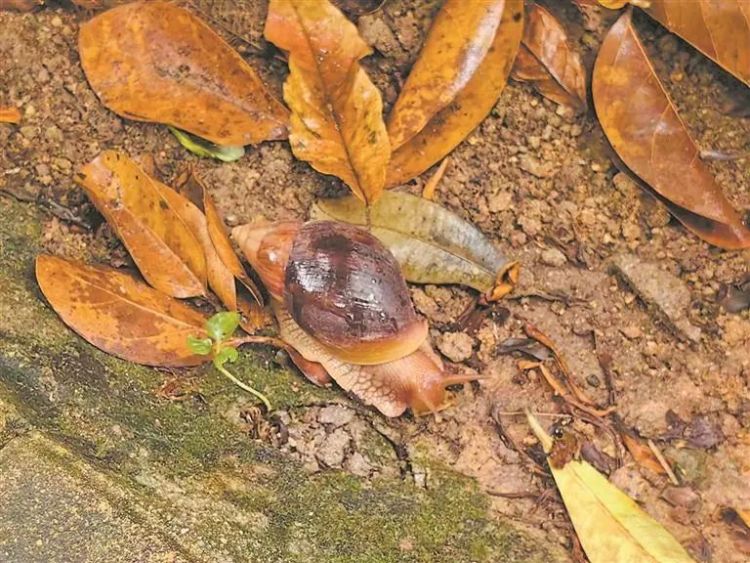 “这种蜗牛在公园里比较常见,尤其是下雨天的晚上数量明显增多,其中很多会爬到路面上来。”经常来此散步的市民黄金星说,由于其颜色与落叶、石头十分相像,有时会被人不小心踩碎,或是将其踢到路边草丛里,公园的保洁人员看到就会及时清理。