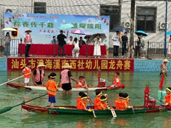 近日,广东汕头澄海区溪南西社幼儿园举办的赛龙舟活动视频走红网络。视频中,孩子们在细雨天身穿救生衣,在泳池中划着特制尺寸的龙舟,争夺着冠军,泳池边的观众打着伞为其助威呐喊。
