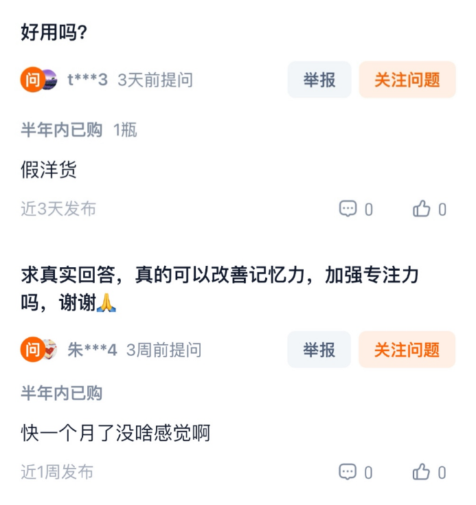 对于这款产品,消费者评价褒贬不一。在商品评论区,有人猜测“应该有点用”,有人表示“快一个月了,没感觉”,更有用户直指,“这就是假洋货”。