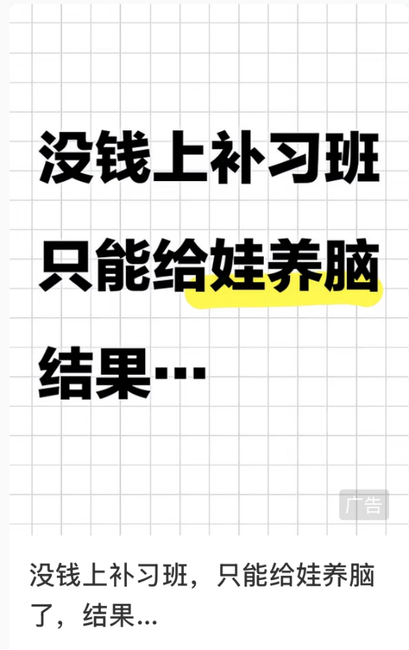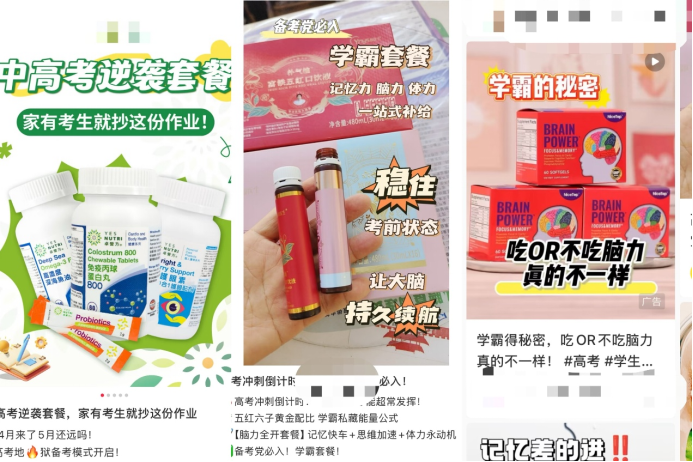 记者浏览社交平台发现,在与高考相关的内容下,多家保健品商家在其产品首页显著标注“学霸套餐”“中高考逆袭套餐”等字样。其中,一条平台标注为广告的白底黑字图片广告语写道:“没钱上补习班,只能给娃养脑,结果……”。
