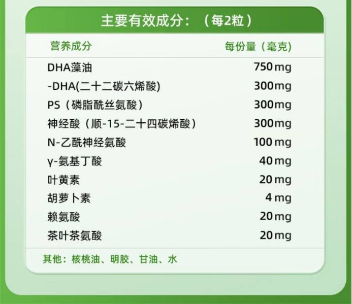 法治网记者调查发现,DHA(二十二碳六烯酸)、PS(磷脂酰丝氨酸)、神经酸是这些“学霸套餐”产品宣传的明星成分和主要卖点。