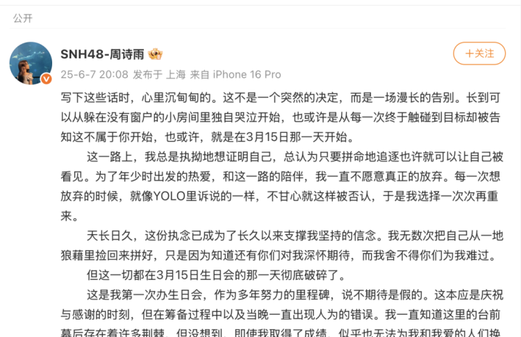 6月7日晚,女子偶像团体成员周诗雨通过个人微博正式宣布与丝芭传媒解约并退出SNH48团体。
