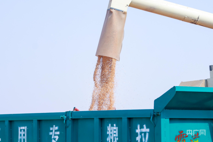 河南省濮阳县子岸镇,饱满的麦粒从收割机里倾泻而下(央广网记者 张羲轮 摄)