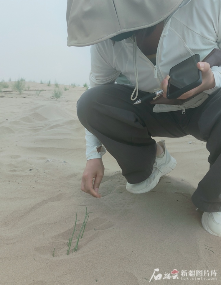 6月16日,在巴楚县琼库尔恰克乡温阿勒台库什村的广袤沙漠中,“环着沙漠看新疆”全媒体报道团队的记者围着一株梭梭树苗,难掩惊喜。这株今年3月种下的梭梭苗,此前已经被风沙掩埋,若不是记者行走沙丘时意外踢开沙土,它仍将“沉睡”在黄沙下。