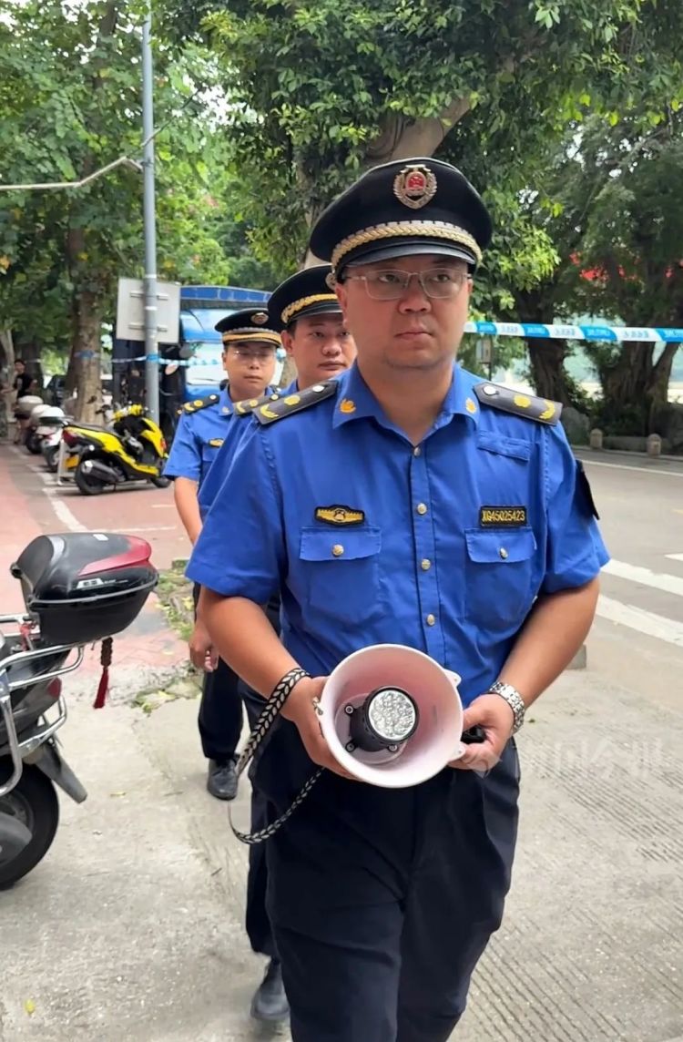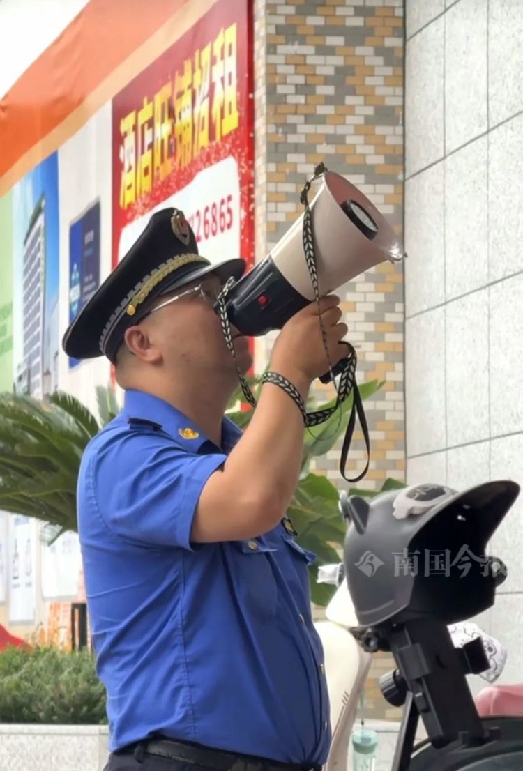 柳州城中区几名执法队员们在滨江西路来回巡逻,手中提着大喇叭放广播,提醒沿街住户、商家赶紧搬离。