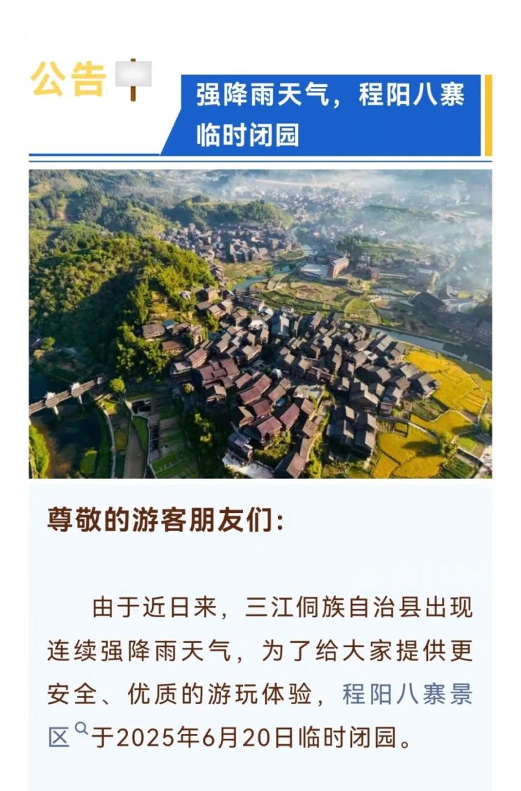 近日来,三江侗族自治县出现连续强降雨天气,为了给大家提供更安全、优质的游玩体验,程阳八寨景区于6月20日临时闭园。