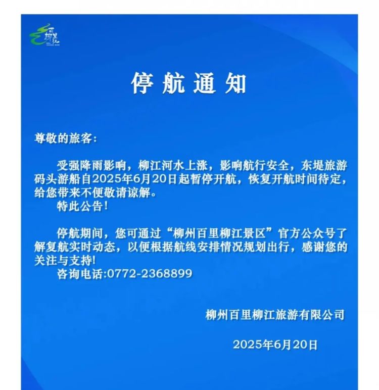 6月20日下午,柳州百里柳江景区发布通知,因柳江河水上涨,20日起,东堤旅游码头游船暂停开航。