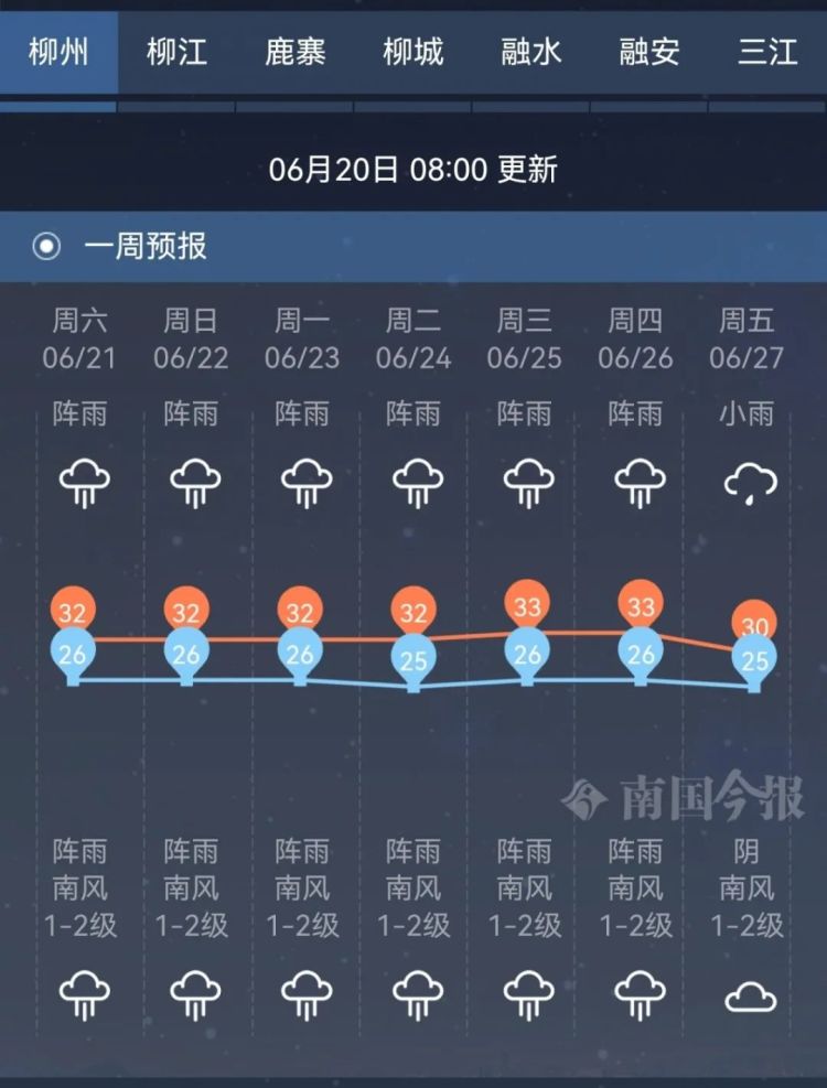 6月20日17时,柳州气象部门同步发布未来一周天气预测。预计受副高西北侧偏南急流影响,未来一周柳州市多降雨,21日北部有大雨到暴雨、局地大暴雨到特大暴雨,22日至24日北部有中到大雨、局地暴雨,后期大部有阵雨、局地中到大雨。