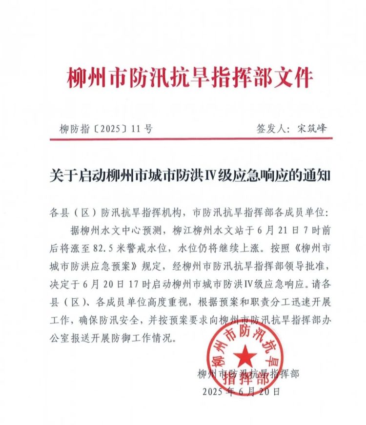 6月20日下午,柳州市防汛抗旱指挥部发布通知,启动柳州市城市防洪Ⅳ级应急响应。
