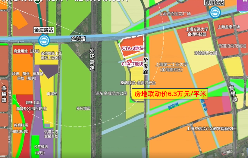 为何地块竞争如此激烈?土拍网分析称,该地块自带“流量密码”,南侧为现象级红盘象屿联发金海汀云台,房地联动价格63000元/平方米,多次开盘售罄。金海汀云台所在浦东新区曹路科教园区单元(PDP0-0306)C1B-1地块,是去年4月由象屿地产和联发集团联合竞得,溢价率6.49%,容积率1.5,成交楼面价33065元/平方米。