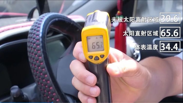 实验开始时,车内未被太阳直射区域温度为39.6℃,太阳直射区域温度为65.6℃,体表温度34.4℃,两分钟内并无不良反应。