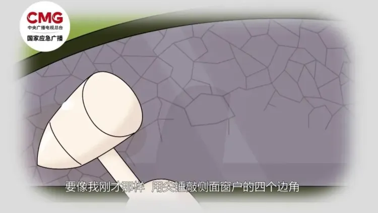 在车内配备安全锤,让孩子知晓必要时可直接击碎车窗玻璃自救。注意!要用锤子敲击侧面窗户的四个边角,才容易砸开。