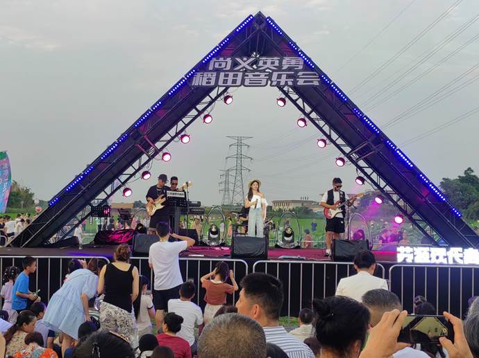 每当夜幕降临,即可享受沉醉的浪漫。英勇社区荷塘畔的稻田音乐会是夜间焦点。霓虹点亮夜空,歌声回荡于稻浪荷风间,万余名游客共聚,随旋律摇摆,绘就“稻香音乐会,人在画中游”的夏夜图景。高潮处,350架无人机编队腾空,在夜空中精准舞动15分钟,变幻出绚烂荷花、辛勤农人、“荷你有约 清凉一夏”、“我在尚义等你”等巨型光影画卷,引发惊叹。