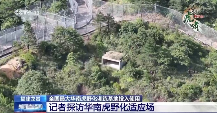 总台记者 赵晟萱:要进入华南虎的野化现场,首先要通过三道铁门。在最后两道铁门中间有一个大约30平方米的缓冲区,这个区域就是工作人员要对华南虎进行麻醉和治疗的场所。进入到野化适应场的内部,这里的面积大约是有42亩,适应场的四周都有双层防护网,它的高度大约是4.5米,两层的防护网中间有一个1.5米的巡护道,方便工作人员进行日常巡护。