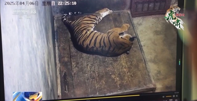 梅花山华南虎繁育研究所兽医师 陈腾腾:像赛赛跟岩岩这对虎的情况,在我们园子里是比较少见的。因为我们很少有见过像这么恩爱的一对模范虎夫妻,像它们晚上回来笼舍,都会在同一张木板床上睡觉,包括互相拥抱着彼此,然后把各自的头枕在对方的身上睡觉,还会互相给对方舔毛、理毛。