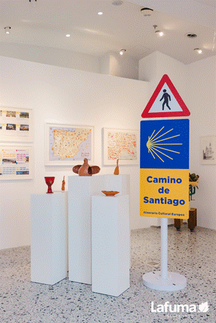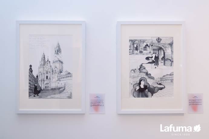 西班牙艺术家Raquel Germade的系列画作将圣地亚哥的传说重塑为女性史诗,在圣地亚哥-德孔波斯特拉这座充满魅力的城市背景下,一段关于魔法与幻想的故事悄然展开。画面里,大教堂化作通往异世界的门户,来自San Paio de Antealtares修道院的修女挺身而出,带领人们脱离这场险恶阴谋。旅居圣地亚哥的艺术家伴侣Jose与Isa,则以画作《O Camiño Empeza Agora》(此刻启程)呈现更具温度的现实主义叙事。作品回溯二人因徒步朝圣之路相识相爱的经历,剖白“行走改变灵魂”的体悟:“重要的不是起点与终点,而是每一步的‘在场’。生命本就是永不停息的道路,每一个终点,都是新的开始”,这一哲思与Lafuma“Share Your Nature”的品牌主张精确呼应。此外,被人们称为“驴子朝圣者”的罗兰·班卡的故事。也在通过系列画作在现场呈现。