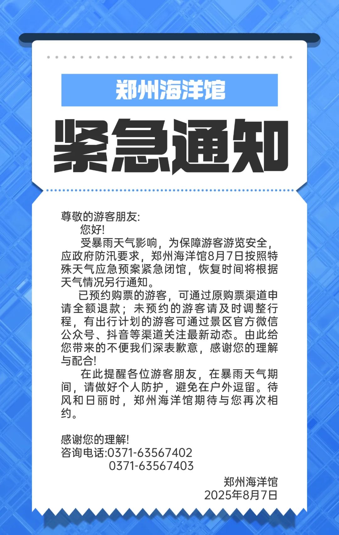 依据省市暴雨预警和三级响应要求,为保障游客安全,郑州黄河文化公园自2025年8月7日15时起临时闭园,开园时间另行通知。