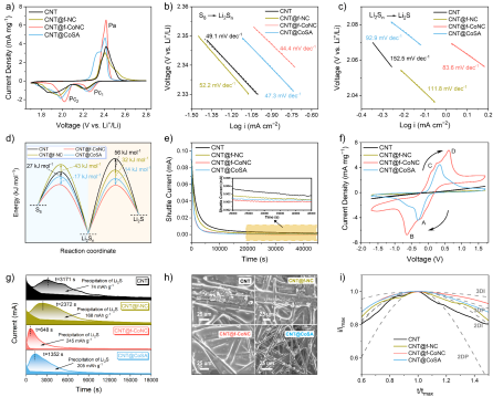 图3. (a) 各电极的CV曲线对比。(b,c) S8→Li2Sn与Li2Sn→Li2S反应的Tafel斜率分析。(d) 反应活化能对比。(e) 穿梭电流测试结果。(f) 对称电池的CV曲线。(g) 硫化锂沉积测试。(h) 硫化锂沉积后电极表面SEM图。(i) 无量纲电流-时间瞬态曲线。