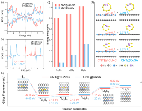 图5. (a) CNT@f-CoNC与CNT@CoSA的态密度(DOS)对比。(b) 二者Co-d轨道投影态密度(PDOS)及d带中心位置。(c) 二者对LiPSs的吸附能。(d) S-S键拉伸效应。(e) 硫还原反应的吉布斯自由能变化。