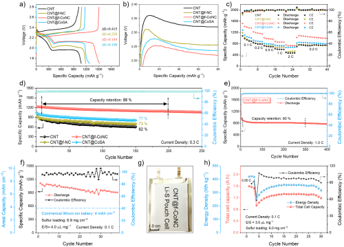由于CNT@f-CoNC对多硫化物优异的吸附效果及催化能力,以CNT@f-CoNC为硫宿主材料组装的锂硫电池表现出全面提升的电化学性能。其中,在超过300圈的循环中展现出了90%的容量保持率,更值得注意的是,在高硫载量6.9 mg cm−2和低E/S比4.0 μL mg−1的苛刻测试条件下,基于CNT@f-CoNC组装的锂硫电池仍然可以实现7.7 mAh cm−2的面容量。同时我们所组装1.6 Ah级的软包电池表现出了422 Wh kg−1的质量能量密度,展现了其实际应用方面的潜力。