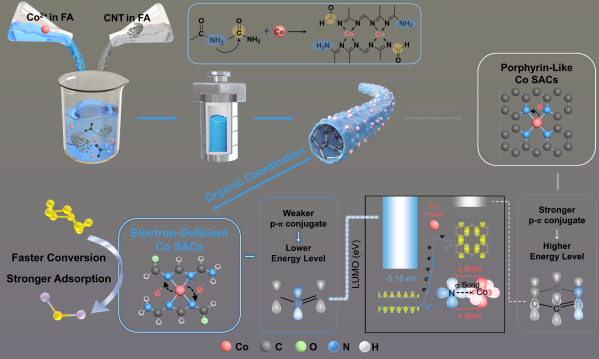 图1. 具有不同配位环境和不同Co SACs电子状态的CNT@f-CoNC和CNT@CoSA合成示意图。