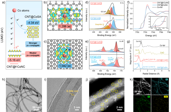 图2. (a) CNT@f-CoNC和CNT@CoSA的LUMO能级及电荷转移示意图。(b,c) 二者的原子结构俯视图与差分电荷。(d,e) 二者的N 1s与Co 2p的XPS光谱分析。(f,g) Co K边XANES谱及傅里叶变换EXAFS谱。(h-j) CNT@f-CoNC的TEM、HRTEM及HAADF-STEM图像。(k) 对应的元素映射图。
