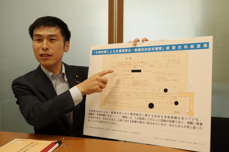 山添拓在参议院预算委员会会议上首次展示了一份名为《芥子气弹射击所致皮肤伤害及一般临床症状观察》的文件副本,其中汇总了1940年9月7日至10日实施的用芥子气弹对人体射击等5种实验的结果,用铁证戳穿日本政府的谎言。