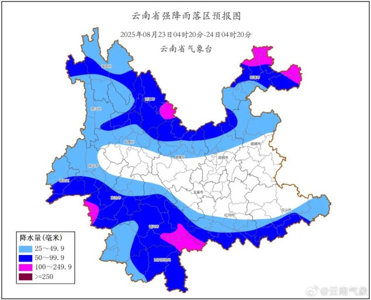 8月23日20时到8月24日20时:昭通市、曲靖市北部、昆明市北部、楚雄州北部、丽江市南部、大理州东部、临沧市东部、普洱市西部有大雨局部暴雨,曲靖市南部、文山州、昆明市南部、玉溪市东部、红河州中东部、迪庆州多云有分散阵雨,其他地区阴天间多云有小到中雨。