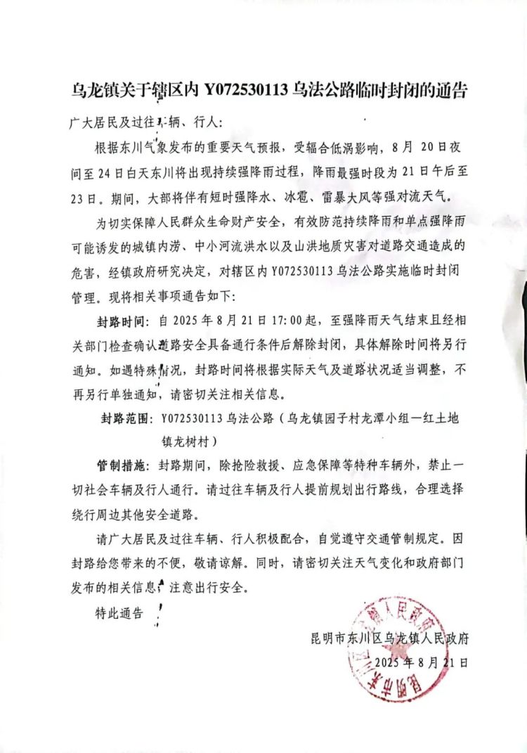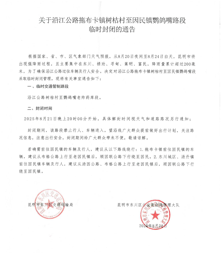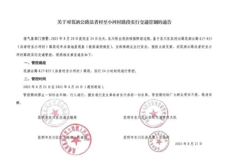 8月22日,昆明市寻甸县交通运输局发布《关于近期寻甸县农村道路交通管制的通告》: