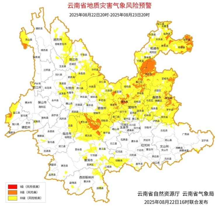 预计8月22日20:00~8月23日20:00,昆明市禄劝县、东川区、寻甸县、嵩明县、宜良县、安宁市、富民县,昭通市绥江县、水富市、盐津县、威信县、镇雄县、彝良县、鲁甸县、巧家县,曲靖市沾益区、马龙区、麒麟区、会泽县、宣威市、富源县、罗平县,玉溪市易门县、峨山县、新平县,楚雄州楚雄市、禄丰市、武定县、元谋县、永仁县、大姚县、南华县、双柏县,普洱市景东县、镇沅县、宁洱县,大理州大理市、南涧县,德宏州盈江县,丽江市华坪县、永胜县,怒江州贡山县,迪庆州香格里拉市发生滑坡泥石流的风险高;昆明市大部,昭通市大部,曲靖市大部,玉溪市北部至西部,保山市南部,楚雄州大部,红河州北部、南部,文山州北部、东部,普洱市北部至中部、南部,大理州东北部至中部、东南部,德宏州西北部,丽江市大部,怒江州北部、南部,迪庆州东部,临沧市东部、西南部发生滑坡泥石流的风险较高。