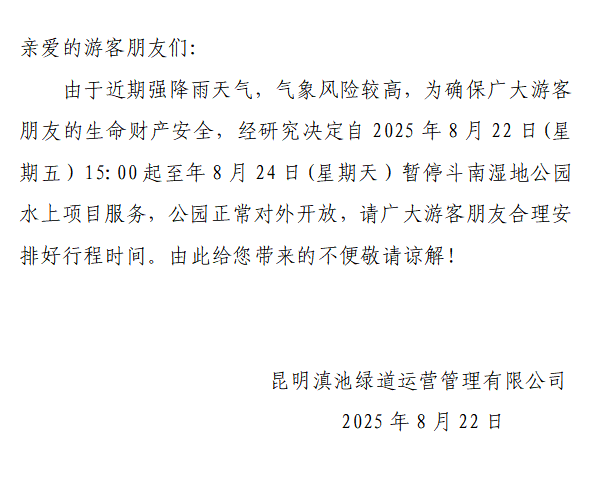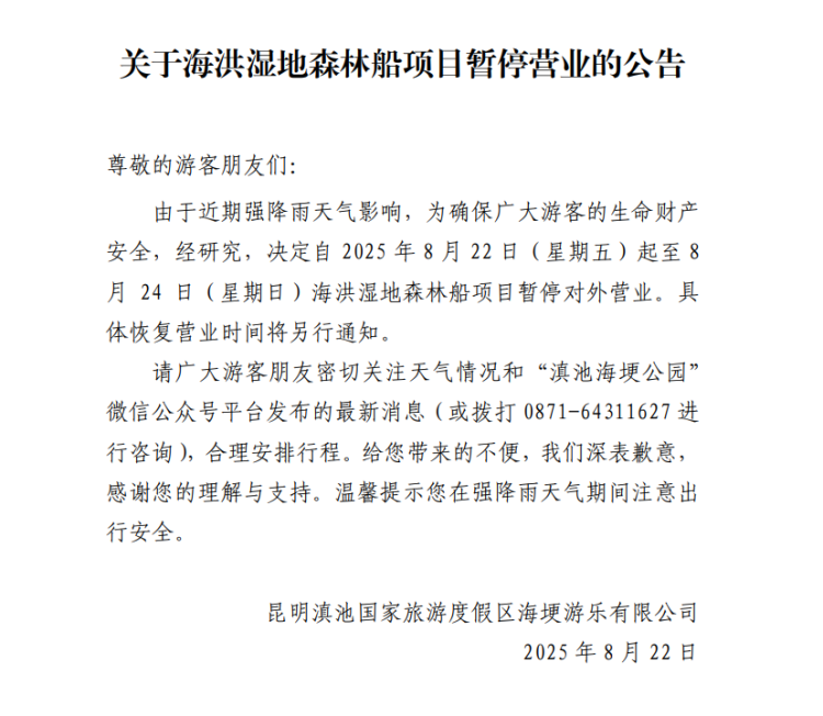 8月22日,昆明滇池国家旅游度假区海埂游乐有限公司发布关于海洪湿地森林船项目暂停营业的公告,由于近期强降雨天气影响,2025年8月22日(星期五)起至8月24日(星期日)海洪湿地森林船项目暂停对外营业,详情如下: