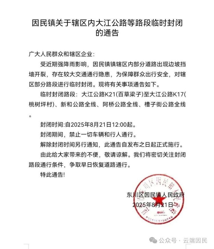 本通告自发布之日起施行,恢复通行时间将根据道路隐患处置情况另行通知。