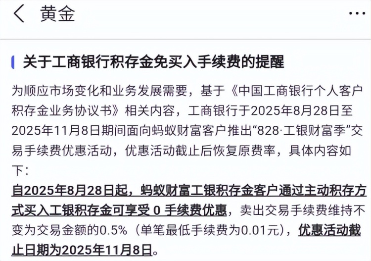 今年七夕节期间,工商银行借“828财富季”推出营销活动,在支付宝、腾讯理财通等平台开展积存金业务0手续费买入优惠,该活动持续至11月8日。
