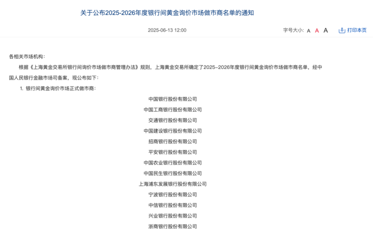今年6月,上海黄金交易所公布《2025-2026年度银行间黄金询价市场做市商名单》,目前,银行间黄金询价市场正式做市商13家,银行间黄金询价市场尝试做市商4家,其中邮储银行今年获批成为银行间黄金询价市场尝试做市商。