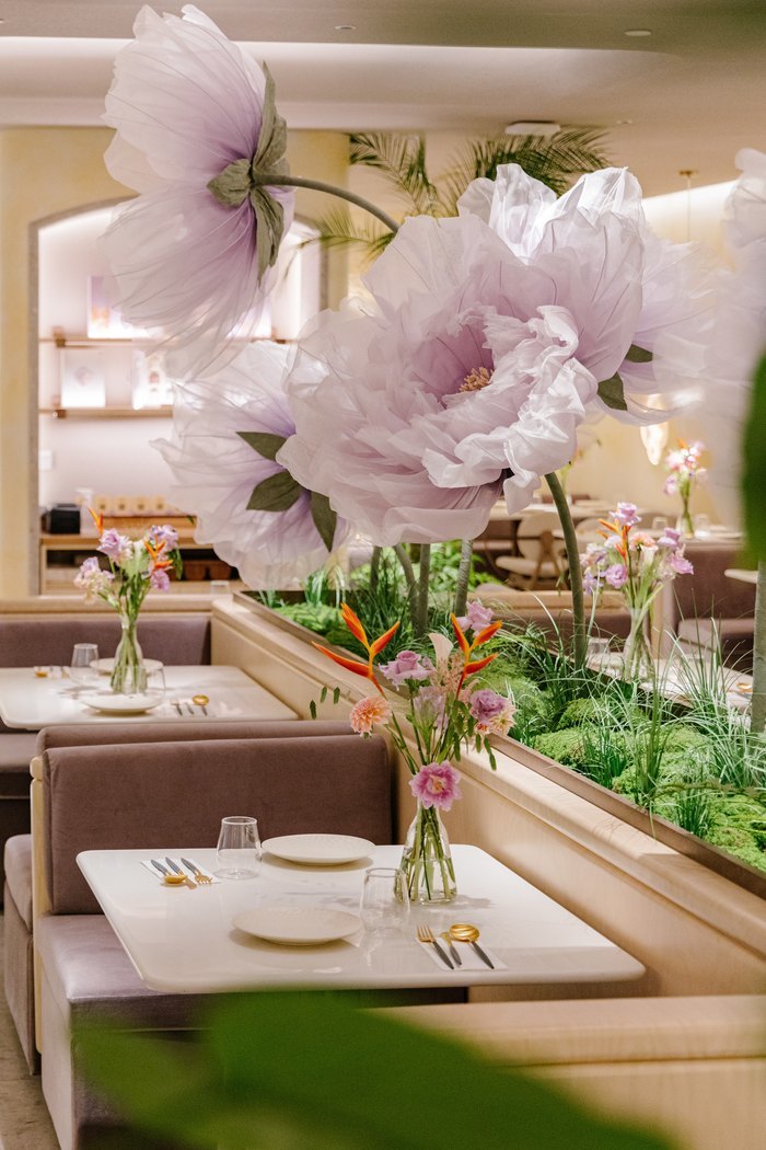 店内主体艺术装置以淡粉紫色牡丹为形态,错落分布于入口、花店与用餐区,结合弧形线条与绒面沙发,在静谧中勾勒出浪漫氛围。浅色基底与点缀其间的绿植相互映衬,共同构筑出“如在牡丹深处用餐”的沉浸式场景体验。