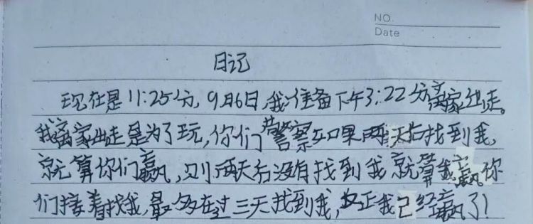 当一本摊开的日记本进入民警视线时,案件很快迎来了转机。“警察哥哥/姐姐们,你们可能不知道我为什么要离家出走……我想看看你们能不能找到我!”字里行间,小胡透露着自己对刑侦破案的痴迷,甚至还精心设计了“48小时破案时限”的挑战书。