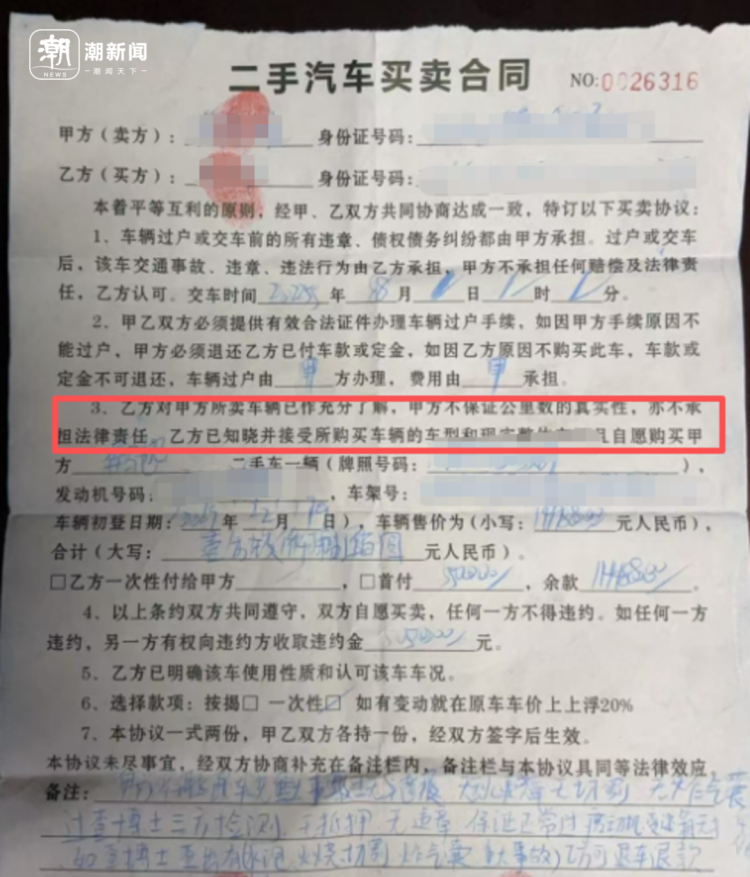 值得注意的是,在杨旭和二手车商签订的合同中,有个条款写道:“乙方对甲方所卖车辆已作充分了解,甲方不保证公里数的真实性,亦不承担法律责任。”