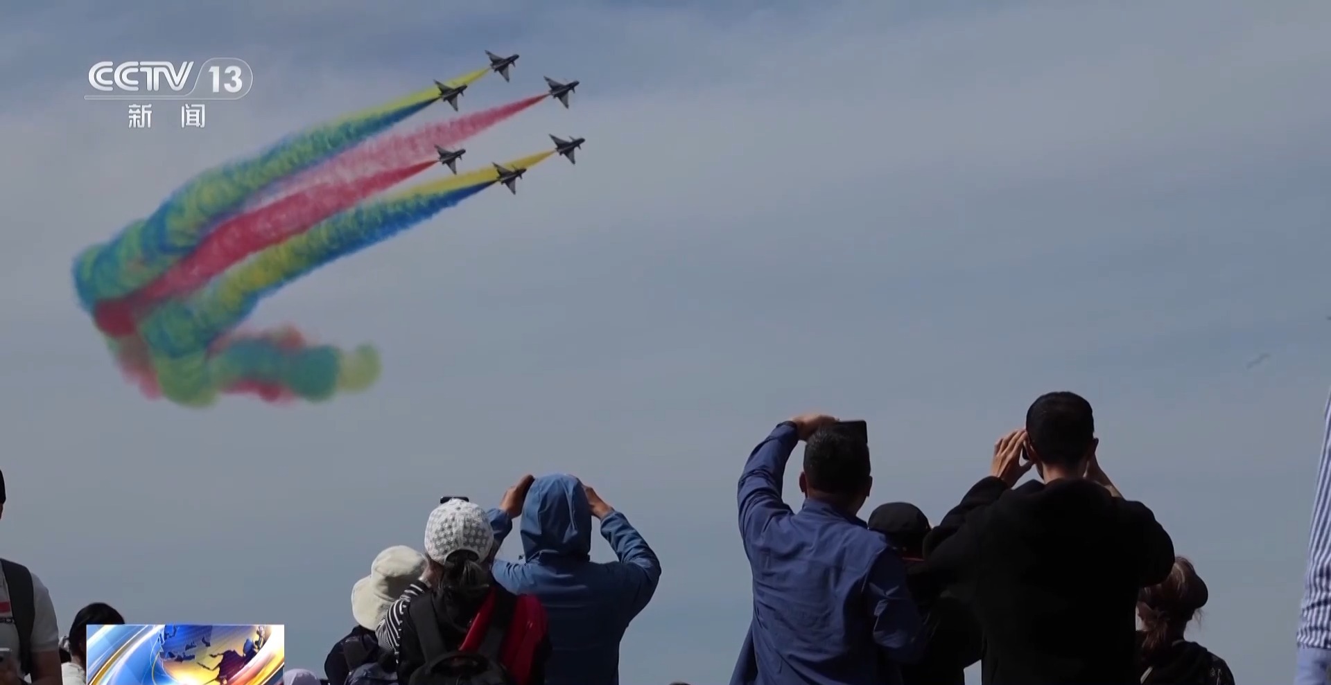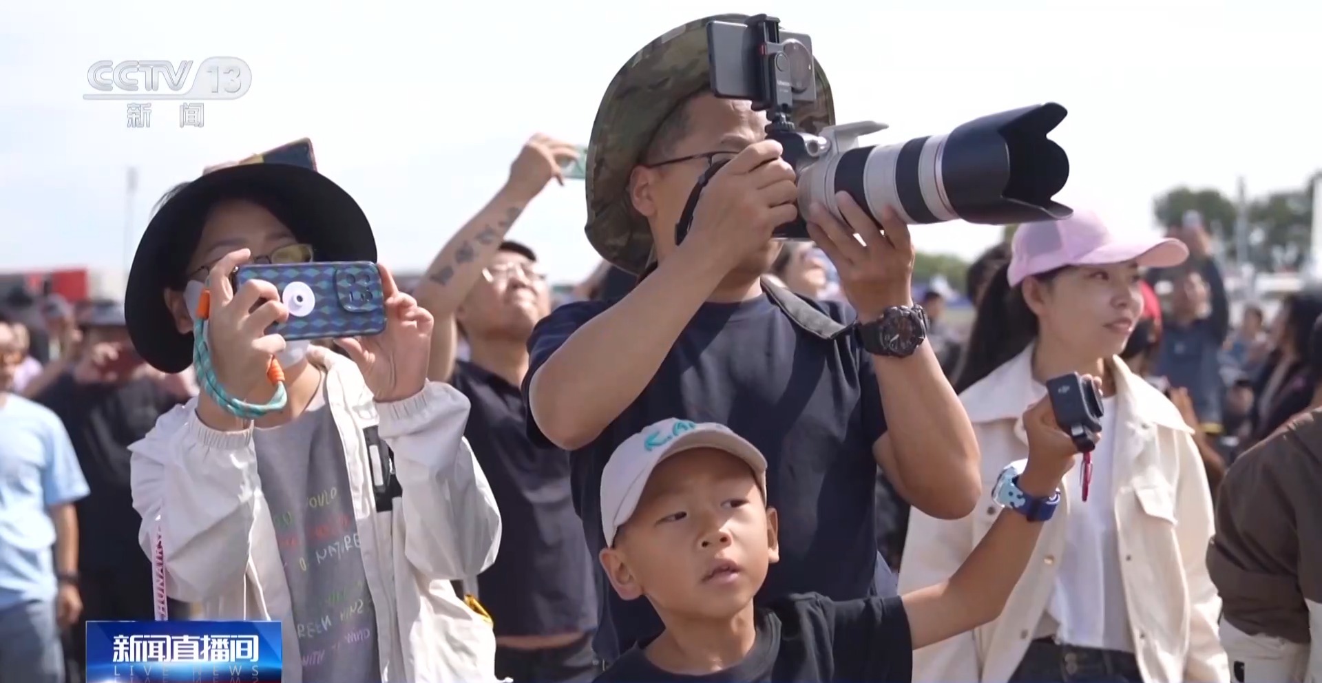 飞行表演开始,所有人动作整齐划一,一起望向天空。运油-20A、歼-16、空警-500、轰-6等战机先后起飞进行通场展示,歼-20、歼-16以及八一、红鹰飞行表演队等先后为观众带来精彩表演。