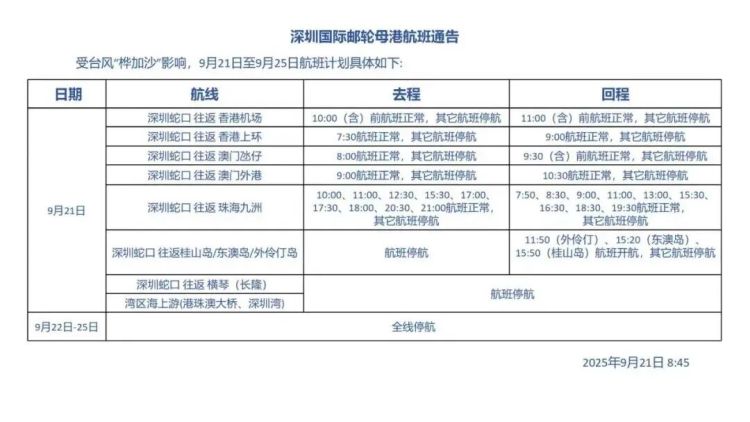 截至21日14时,深圳海事局共叫应点验船舶1480艘,33艘高速客船航线、观光船航线、交通船航线全部停航。