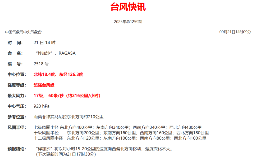 根据上述预报和国省市会商研判意见,“桦加沙”具有极端性,强度极强、破坏性极强,深圳市气象台预计将在21日下午至23日夜间陆续发布台风白色、蓝色、黄色、橙色、红色预警信号,23日夜间到24日是风雨最强时段,陆地最大阵风可达12-14级,沿海、海区和高地最大阵风可达15-17级,深圳(含深汕)23-25日将有全市性大暴雨局部特大暴雨,需提前做好巨灾防御准备。