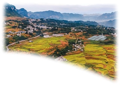 在湖南省衡阳市衡阳县库宗桥镇华山村,从高处俯瞰,一幅精美的“稻田画”在田野上铺展开来。紫、黄、绿三色的水稻品种,勾勒出稻穗、耕牛、粮仓等元素,生动呈现丰收的喜悦。