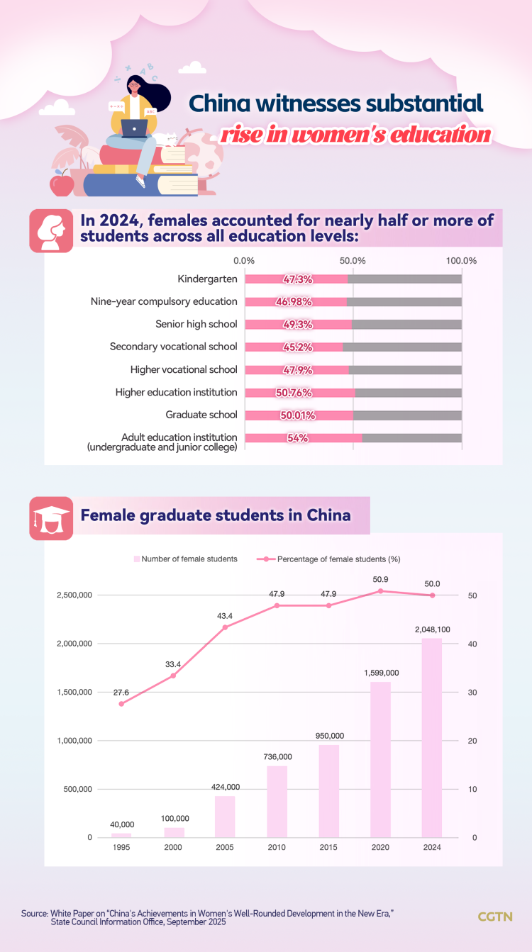 According to the white paper "China's achievements in women's well-rounded development in the new era," China has introduced four national outlines for women's development since 1995, each setting key goals, strategies, and measures for women's development in its corresponding phase.
