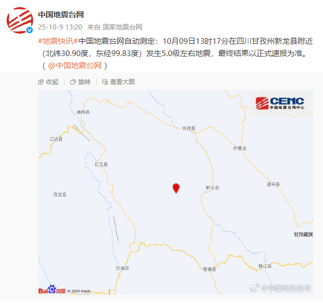 中国地震台网自动测定:10月09日13时17分在四川甘孜州新龙县附近(北纬30.90度,东经99.83度)发生5.0级左右地震,最终结果以正式速报为准。