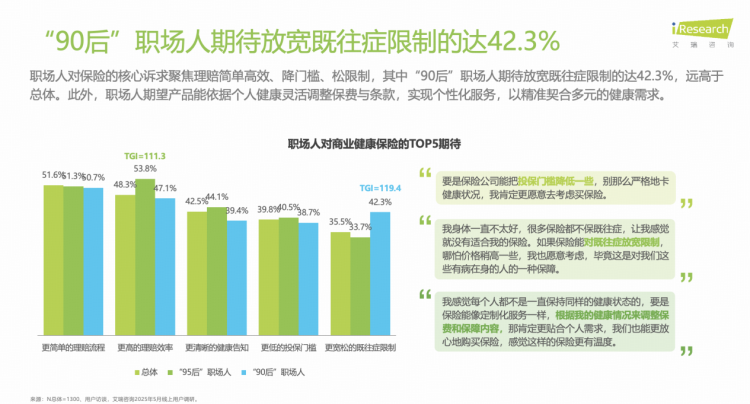 带病体保险市场正迎来历史性机遇,满足职场人特别是带病体人群的健康保障需求,将成为行业新增长点。只有切实解决带病群体"产品少、投保难、条款复杂"等痛点,才能实现保险保障的普惠价值。《白皮书》数据也显示,"90后"职场人期待放宽既往症限制的达42.3%。