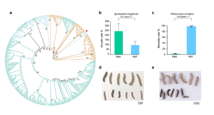 研究结果揭示了苔藓植物中一个源自真菌的抗虫蛋白基因家族的演化历史。这种抗虫蛋白(FBT)具有显著的杀虫活性,且分子量小、水溶性高,显示出良好的应用潜力。