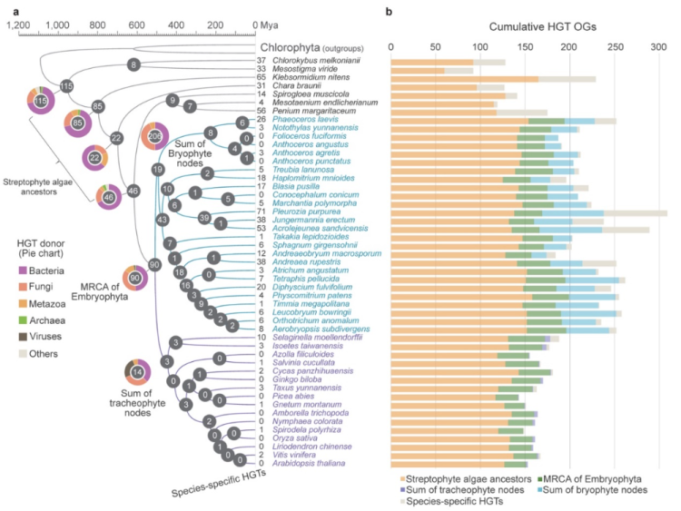 研究显示,苔藓植物每个基因组平均包含约229个来源于细菌、真菌、病毒等的“外源基因”,显著高于维管植物的平均163个。与维管植物中多数HGT基因主要继承自远古的陆地植物祖先不同,苔藓的HGT事件贯穿于其演化历程的各个阶段。