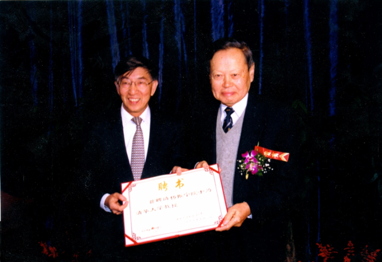 1999年,杨振宁(右)从时任清华校长王大中(左)手中接过清华大学聘书。(清华大学供图)