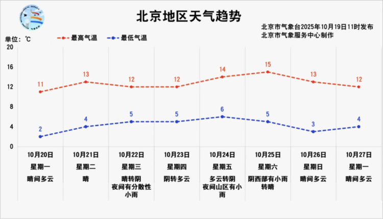 北京市气象台预报显示,新的一周,天气以晴到多云为主,在22日夜间、24日夜间至25日白天有弱降水,请注意防范并关注临近预报。下周,白天最高气温在11~15℃之间,夜间最低气温在2~6度之间。