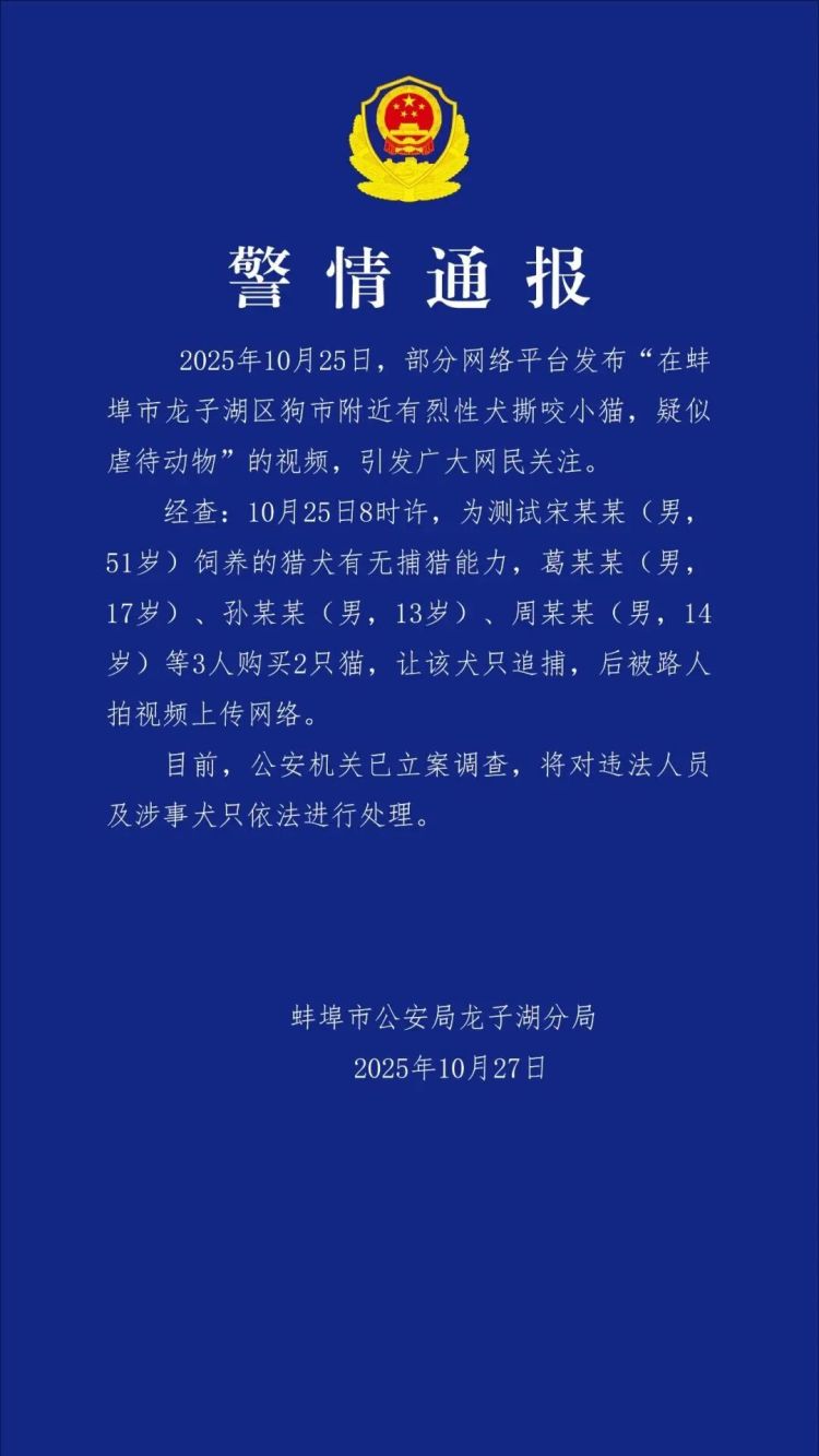 同日,安徽蚌埠市公安局龙子湖分局发布警情通报称:公安机关已立案调查,将对违法人员及涉事犬只依法进行处理。详情如下: