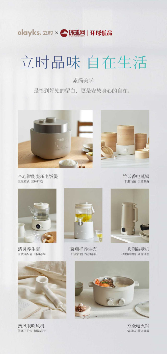 好看又好用的器物,总能轻易将平凡日常点化为充满仪式感的美好瞬间。从承载着手作温度的“竹云香竹笼电蒸锅”,三压可选专胆专用的“合心智能变压电饭煲”,到抚慰人心的“清灵全玻璃养生壶”……本期环球优品,让我们一同探寻olayks立时如何以充满东方美学的原创设计,让小家电回归功能的纯粹与使用的愉悦,为现代生活注入一份难得的自在与从容。